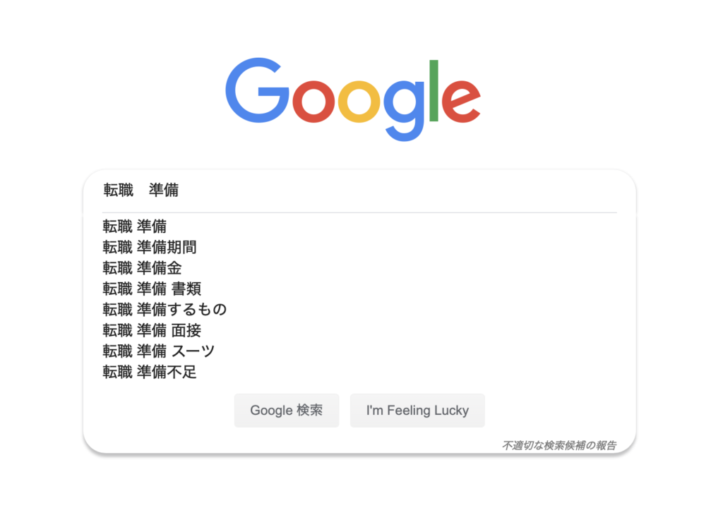 では、試しに「転職 準備」で検索してみましょう。すると、以下のような検索候補が現れます。